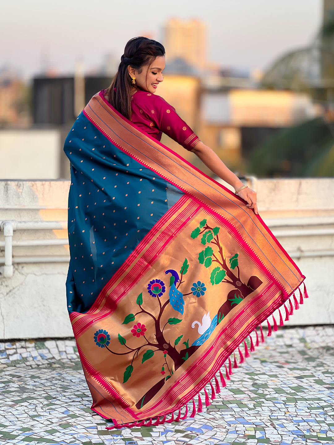 Blue Contrast Zari Woven Chandrakor Swan Yeola Paithani Silk Saree