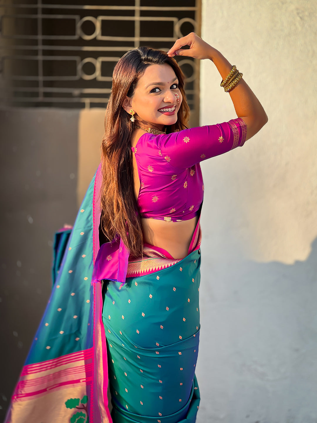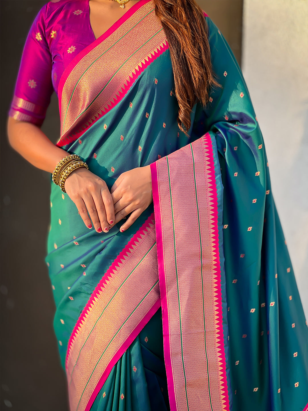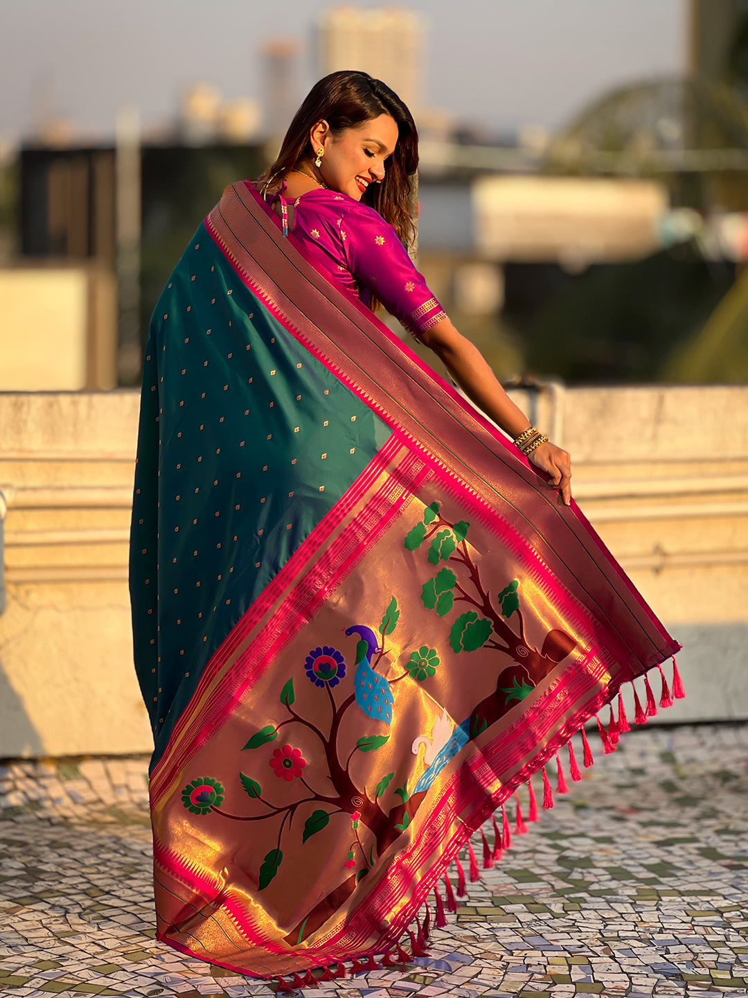 Green with Pink Polka Paithani Silk Contrast Zari Woven Saree with Unstitched Blouse