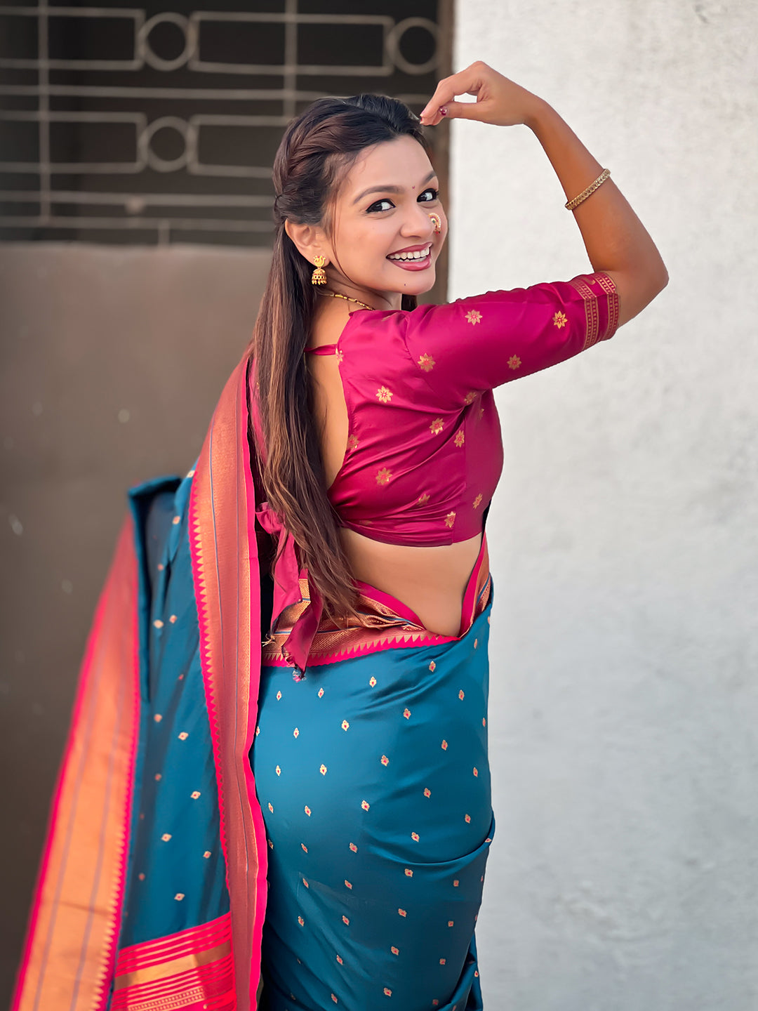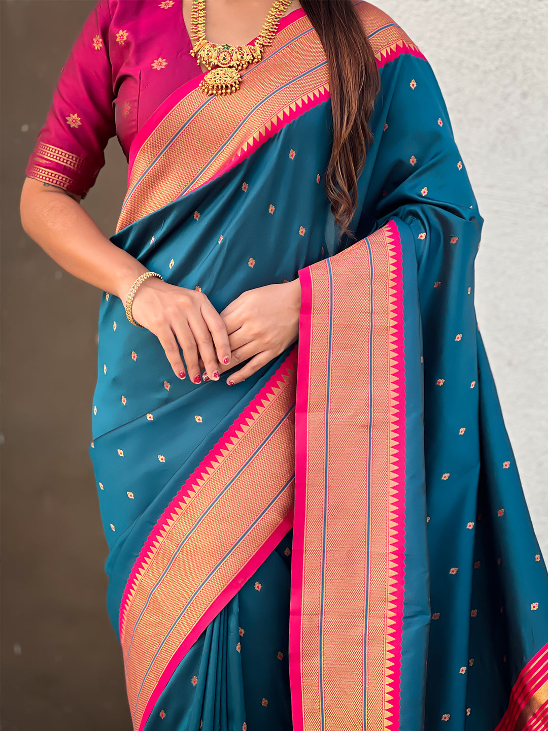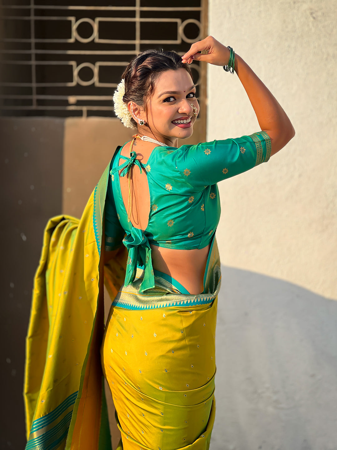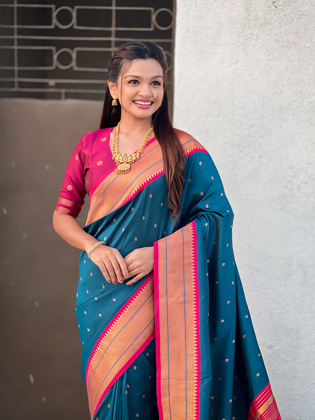 Green with Pink Polka Paithani Silk Contrast Zari Woven Saree with Unstitched Blouse