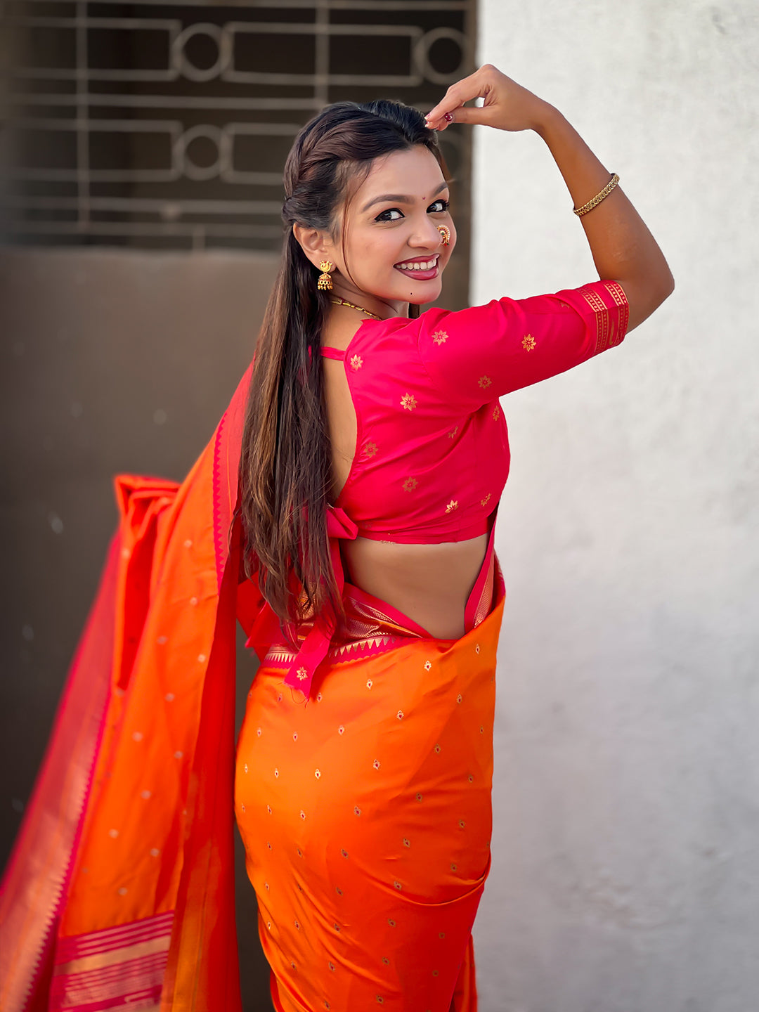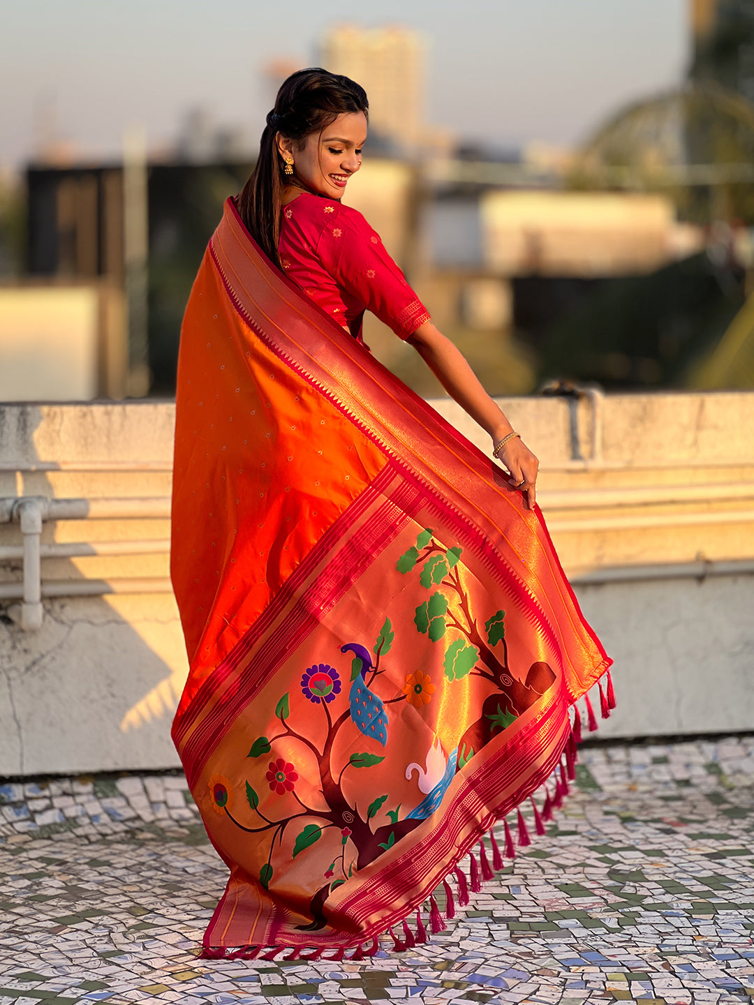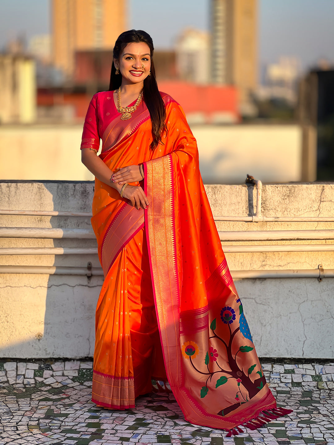 Orange Zari Woven Nath Contrast Yeola Paithani Silk Saree