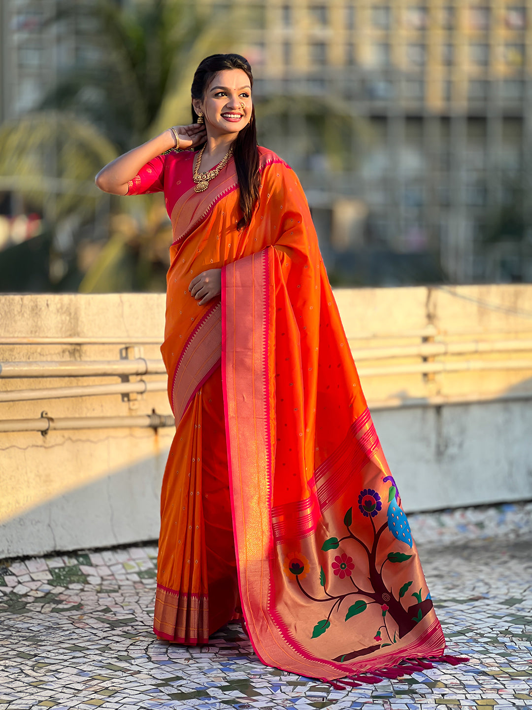 Orange Chandrakor Paithani Silk Banarasi Zari Woven Saree