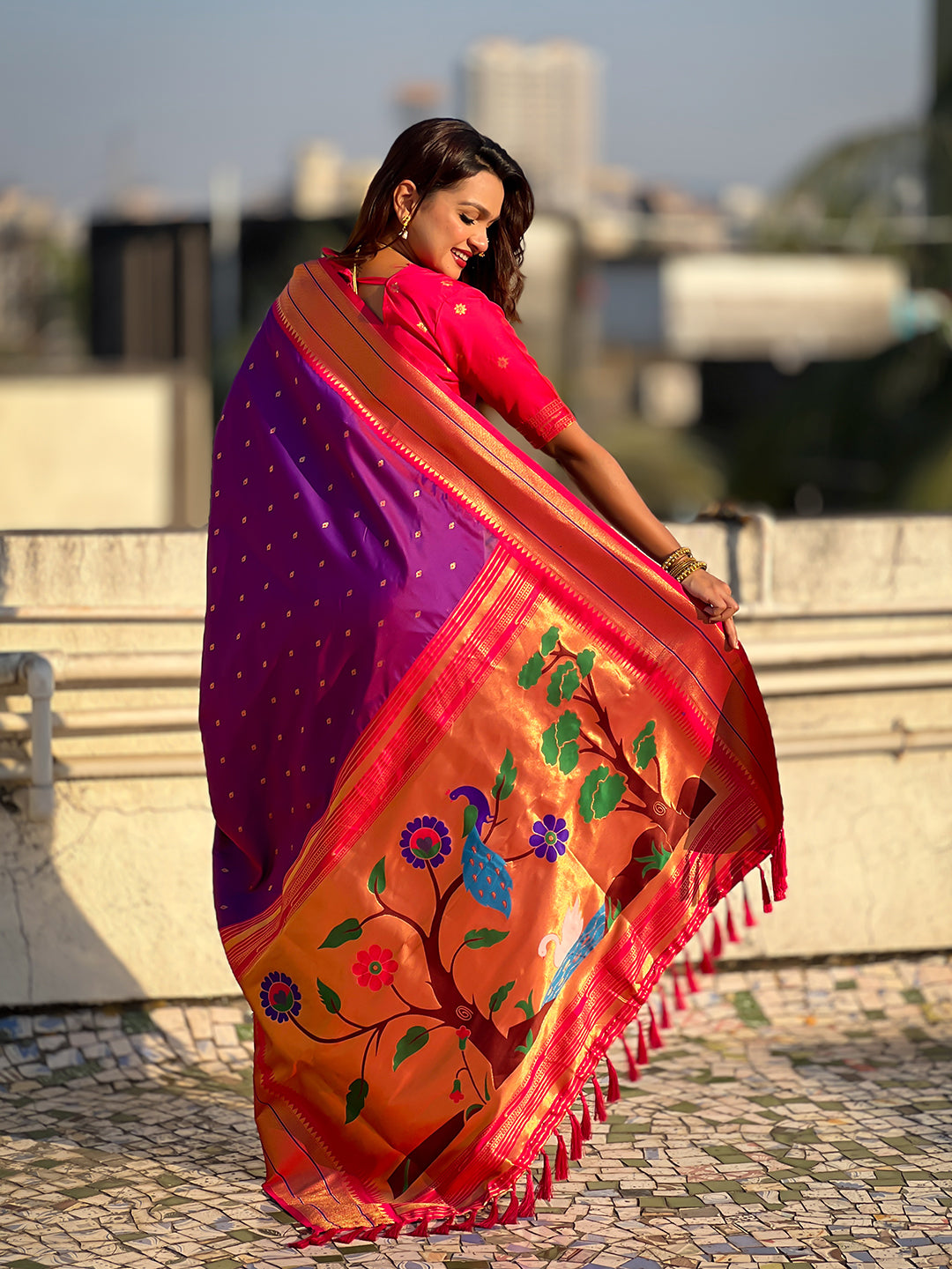 Warm Purple Contrast 1000 Butti Zari Woven Paithani Silk Saree