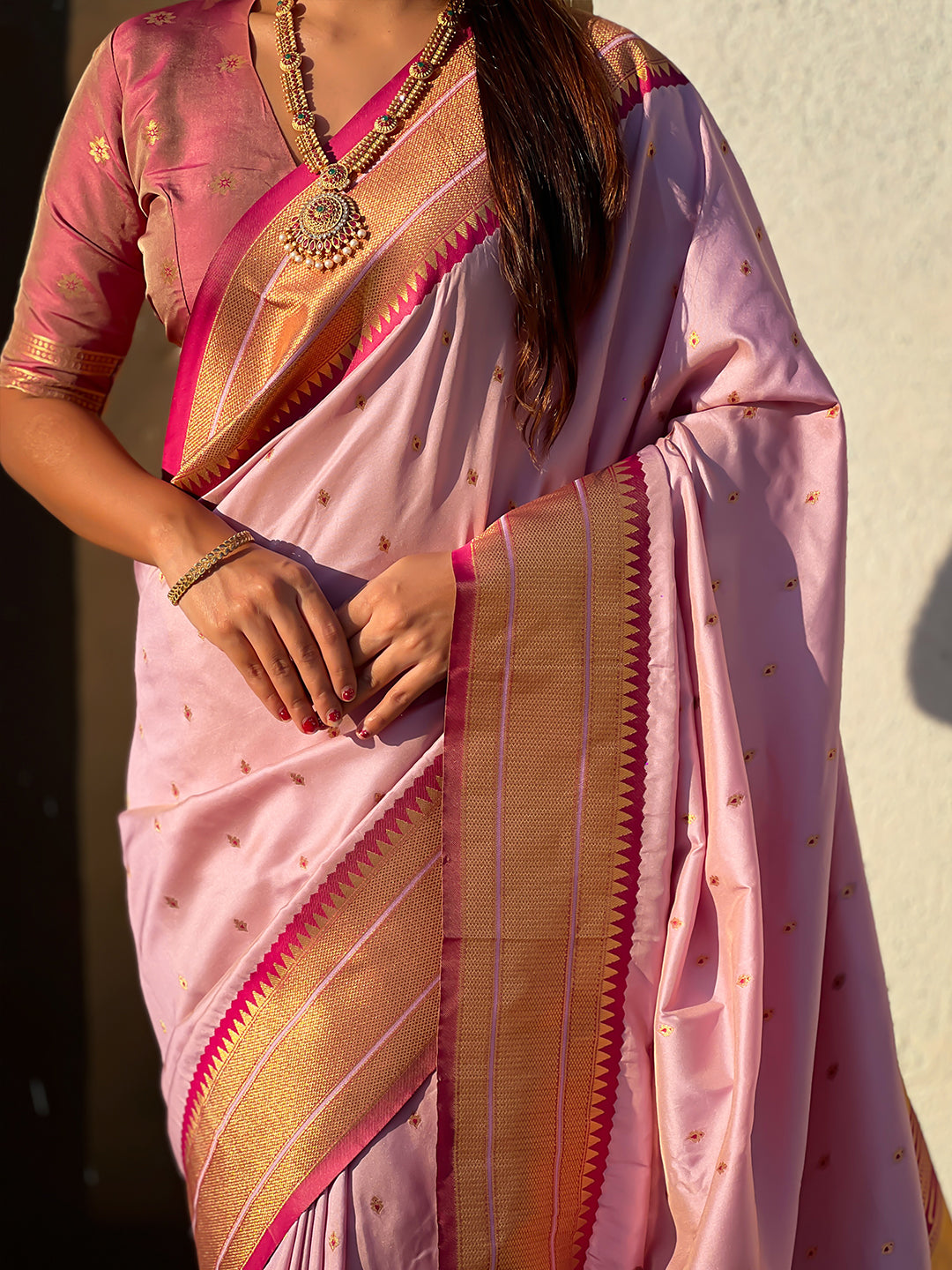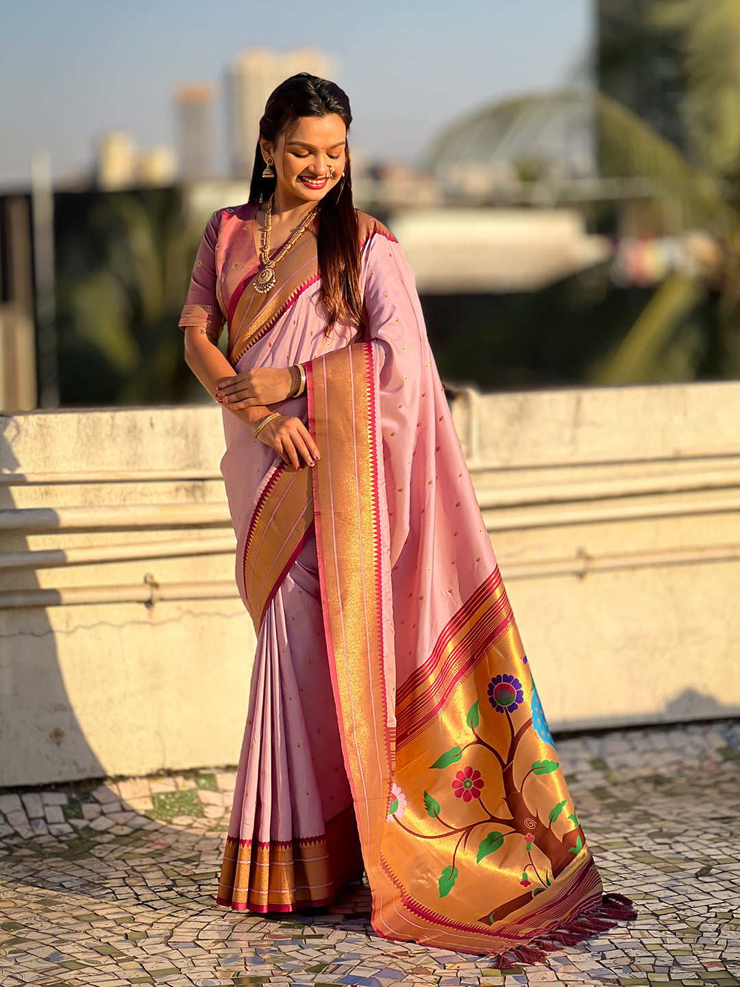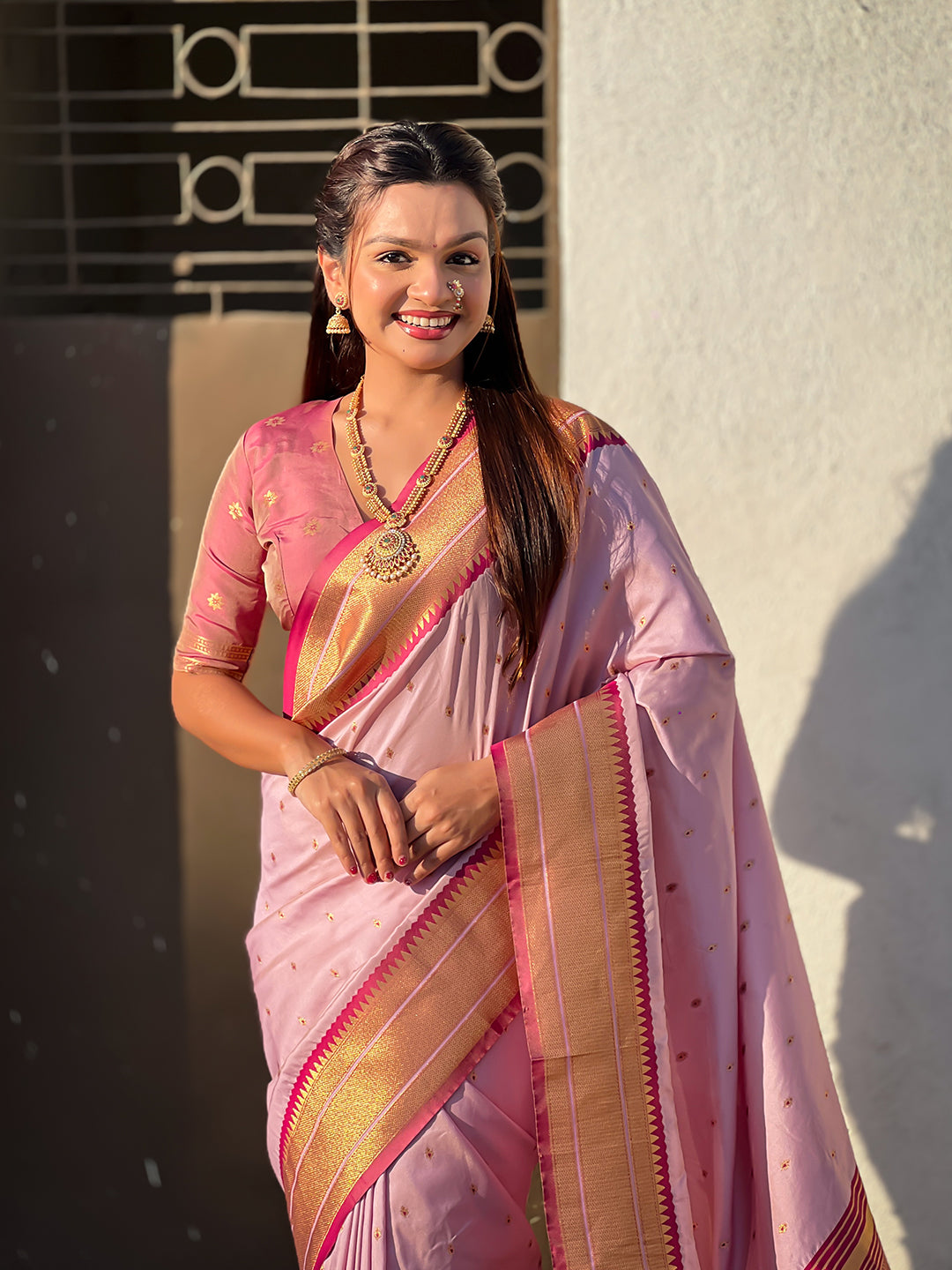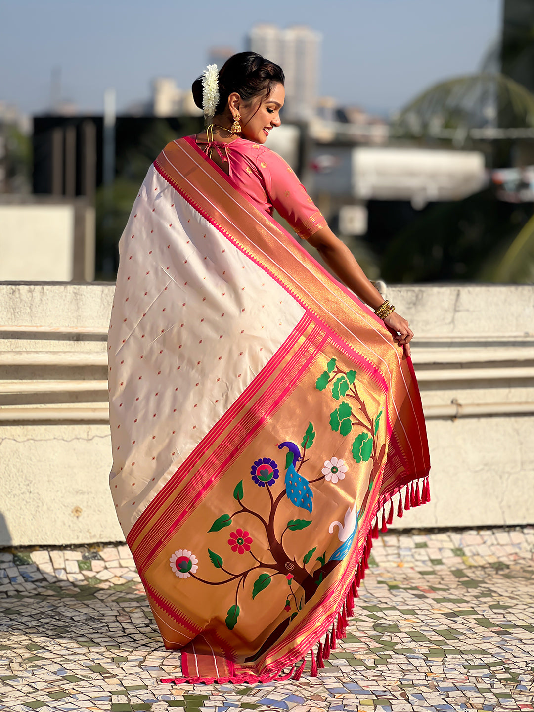Pink Polka Paithani Silk Contrast Zari Woven Saree with Unstitched Blouse