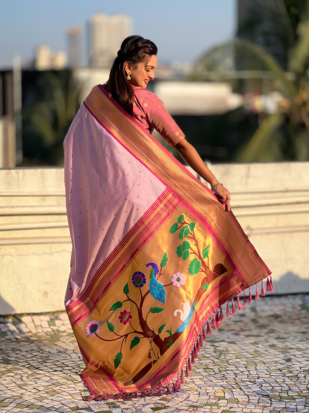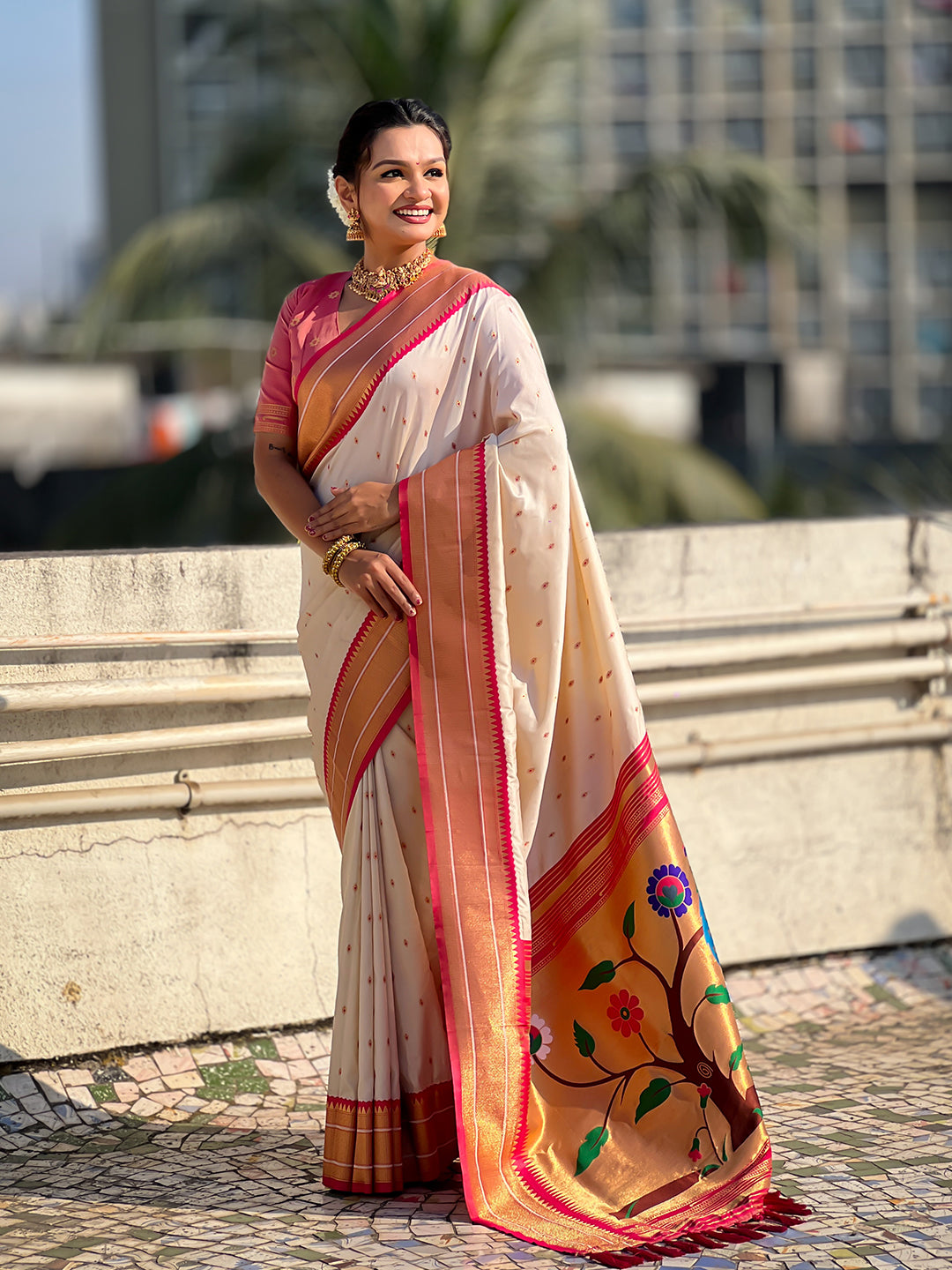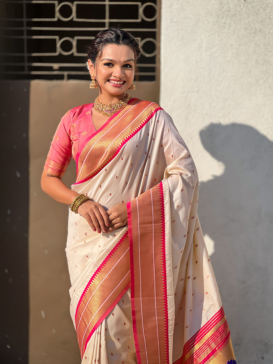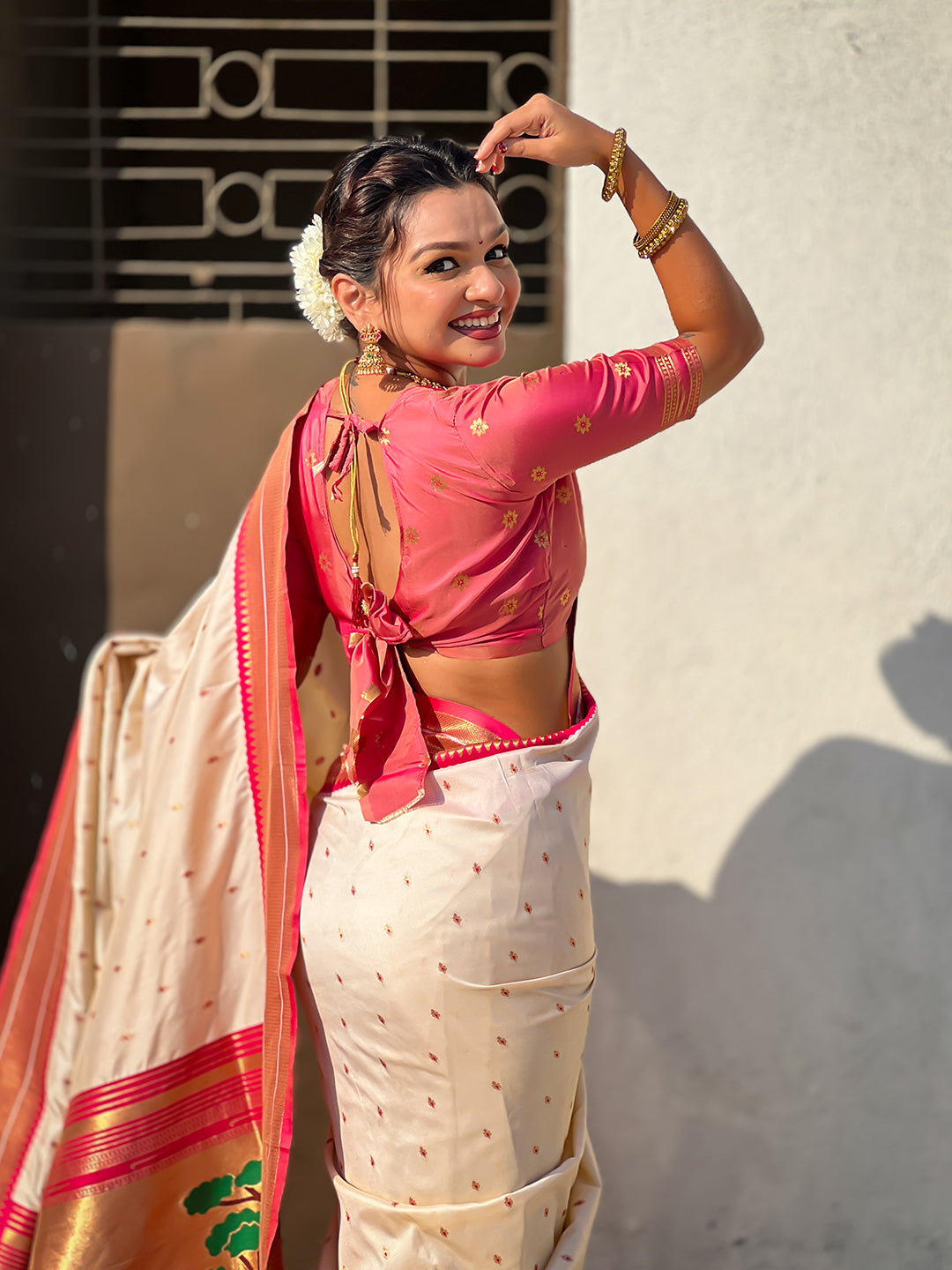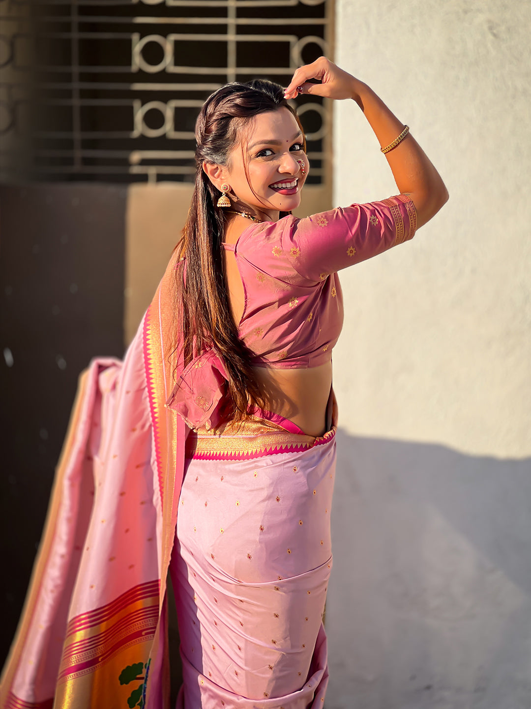 Pink Polka Paithani Silk Contrast Zari Woven Saree with Unstitched Blouse