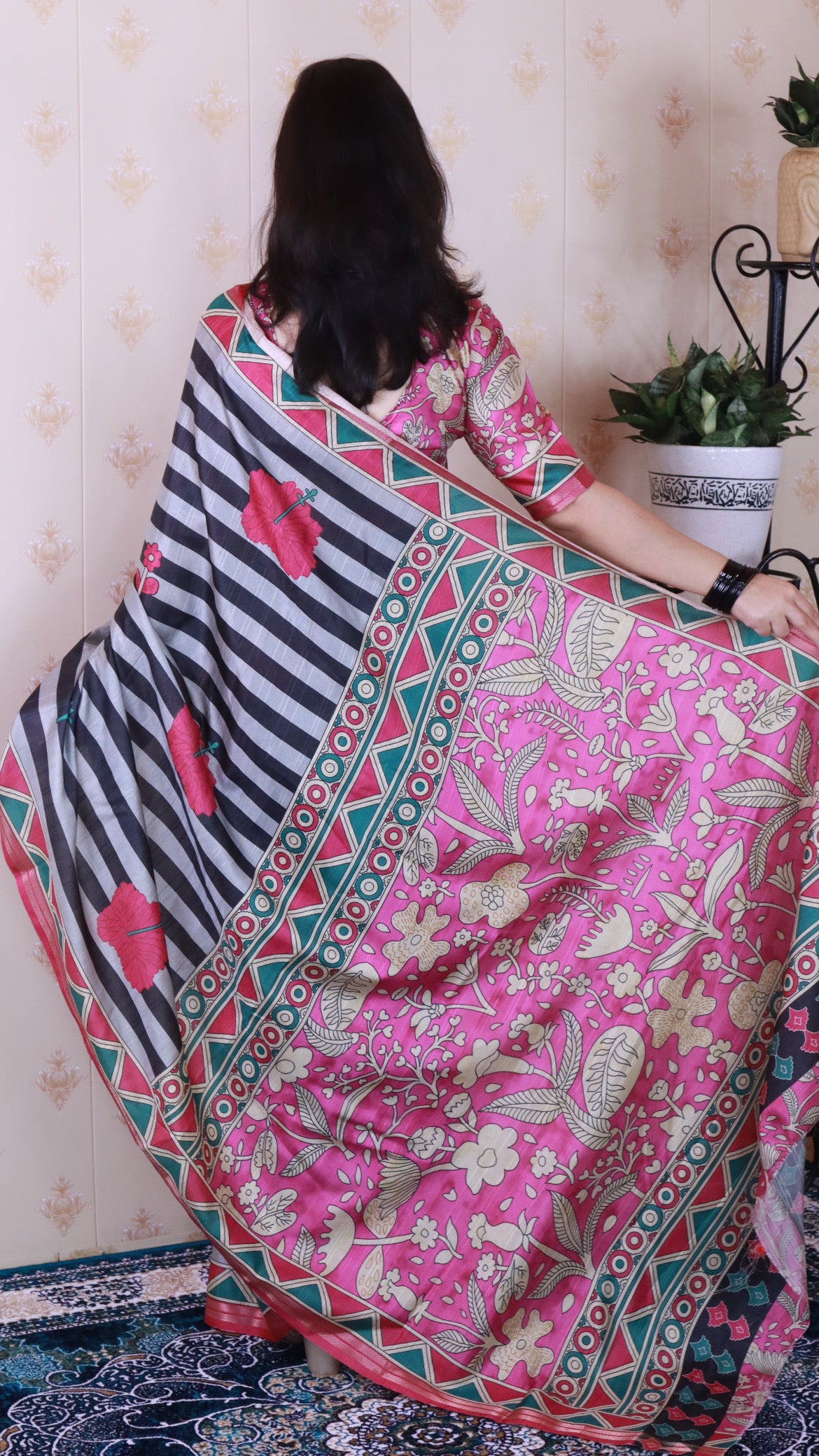Grey Soft Tussar Silk Striped Traditional Printed Zari Woven Saree