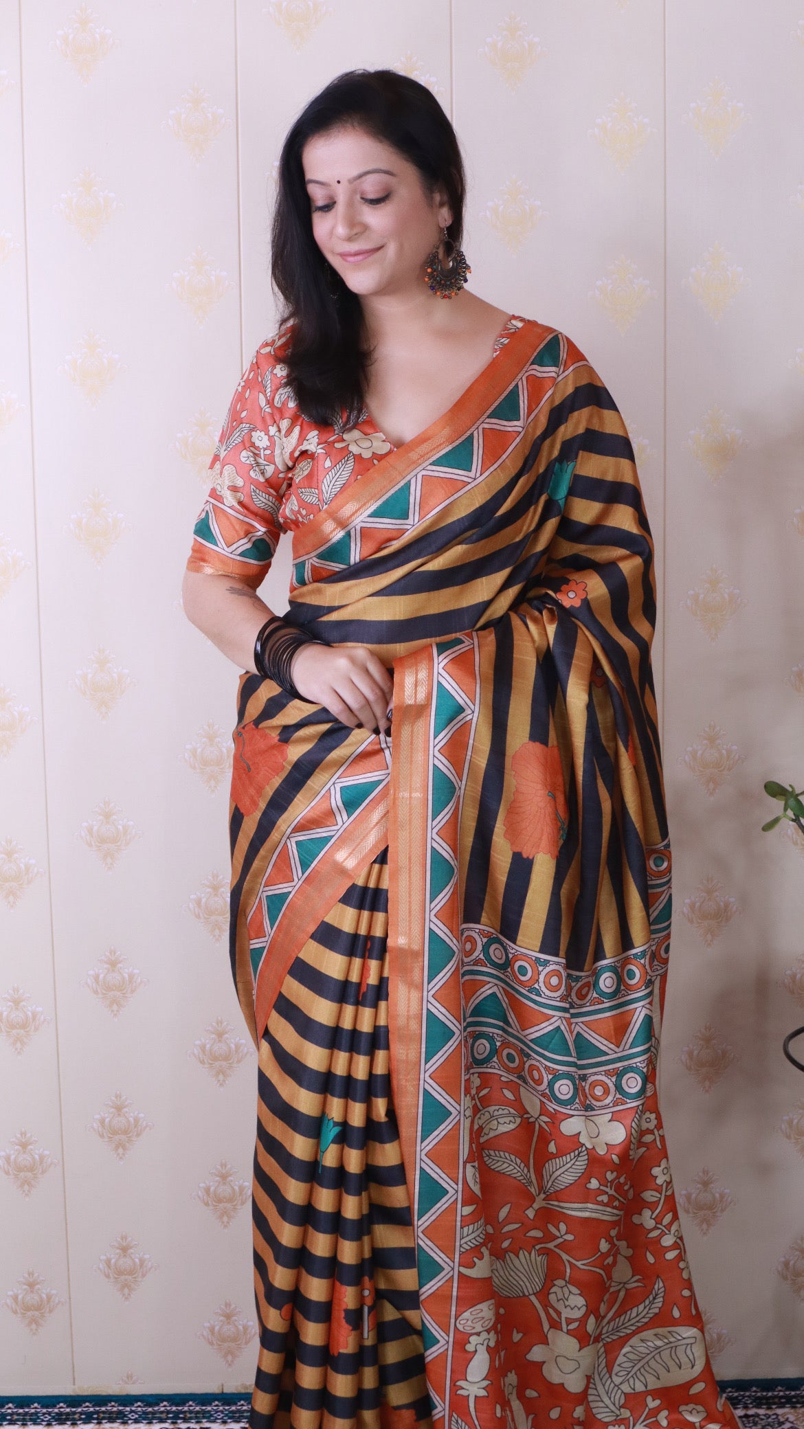 Orange Soft Tussar Silk Striped Traditional Printed Zari Woven Saree