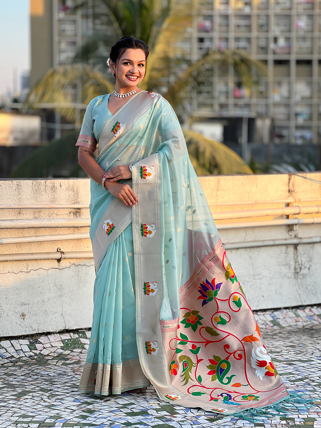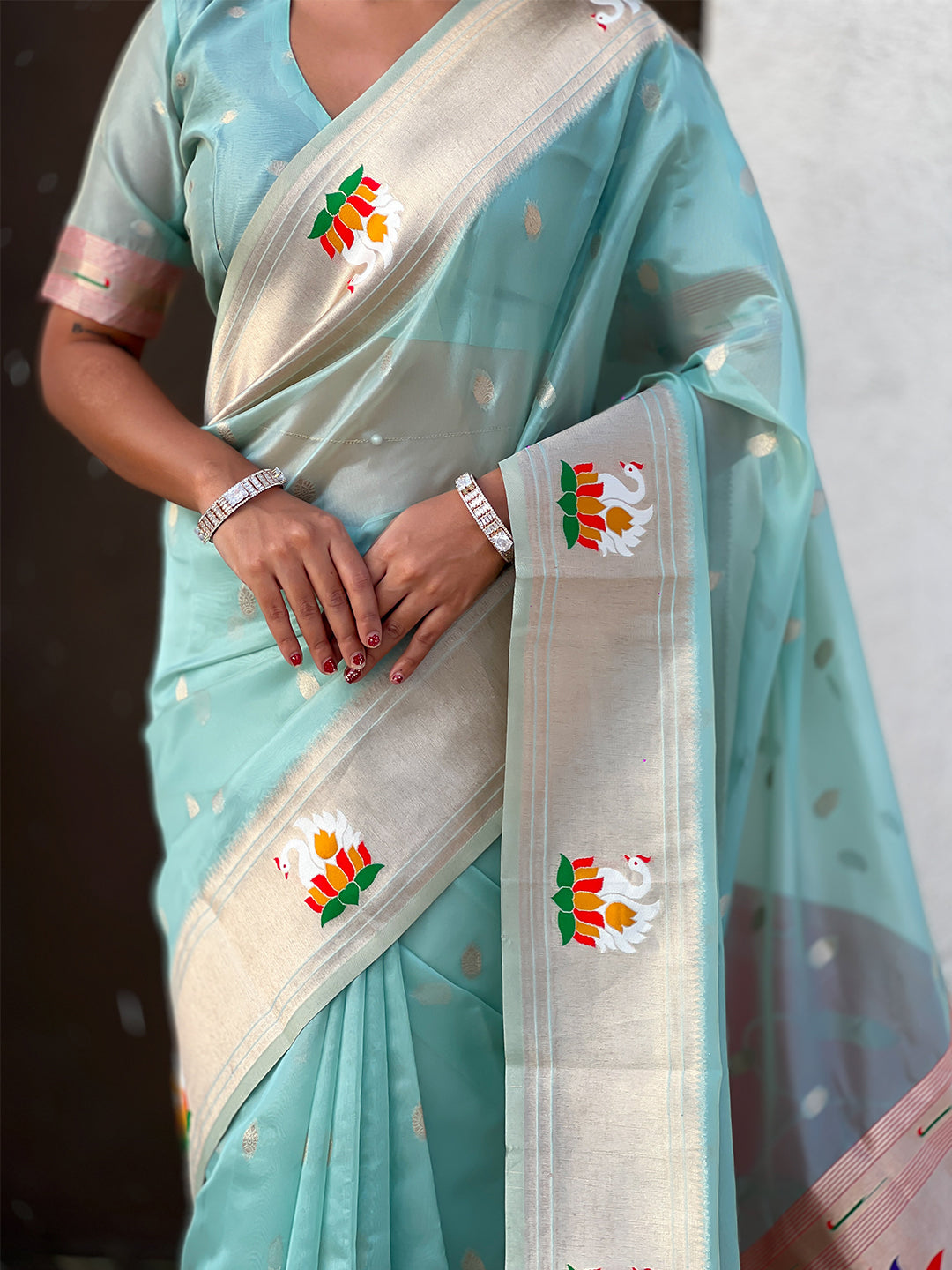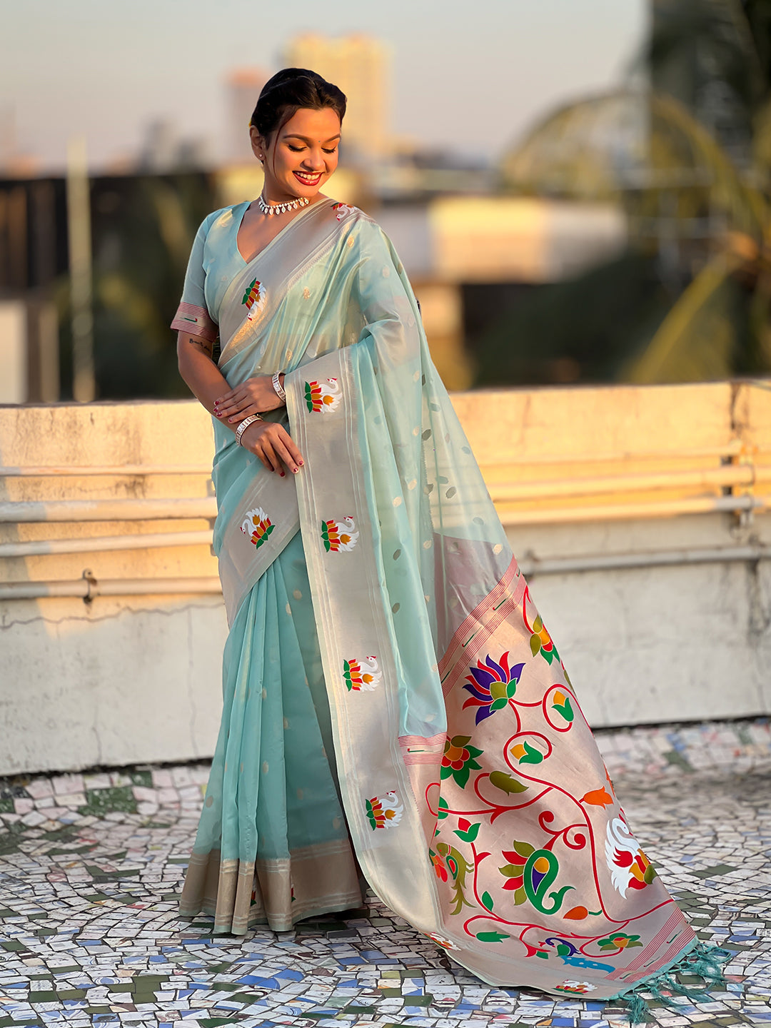 Sky Blue Organza Swan Paithani Silk Zari Woven Saree