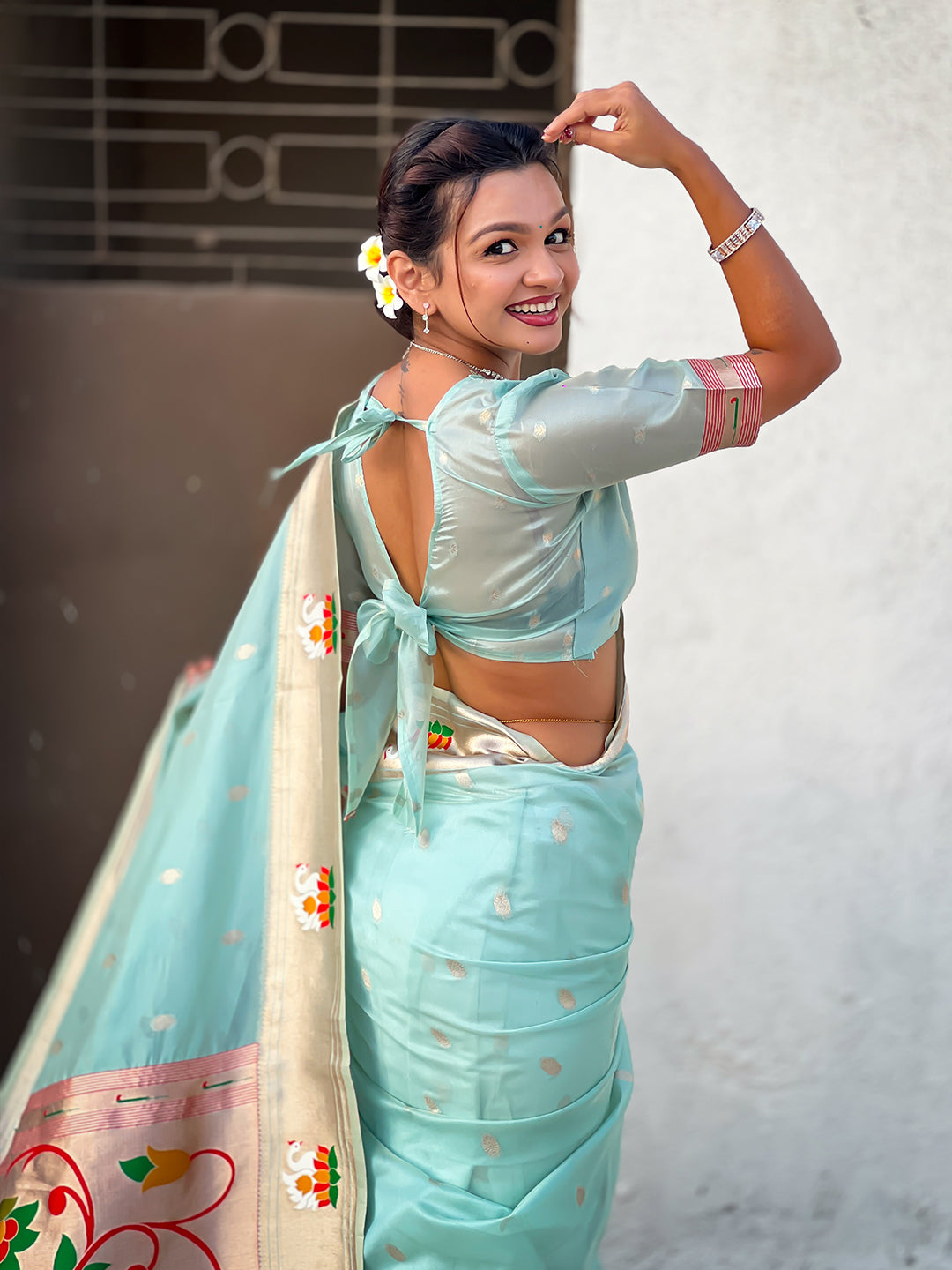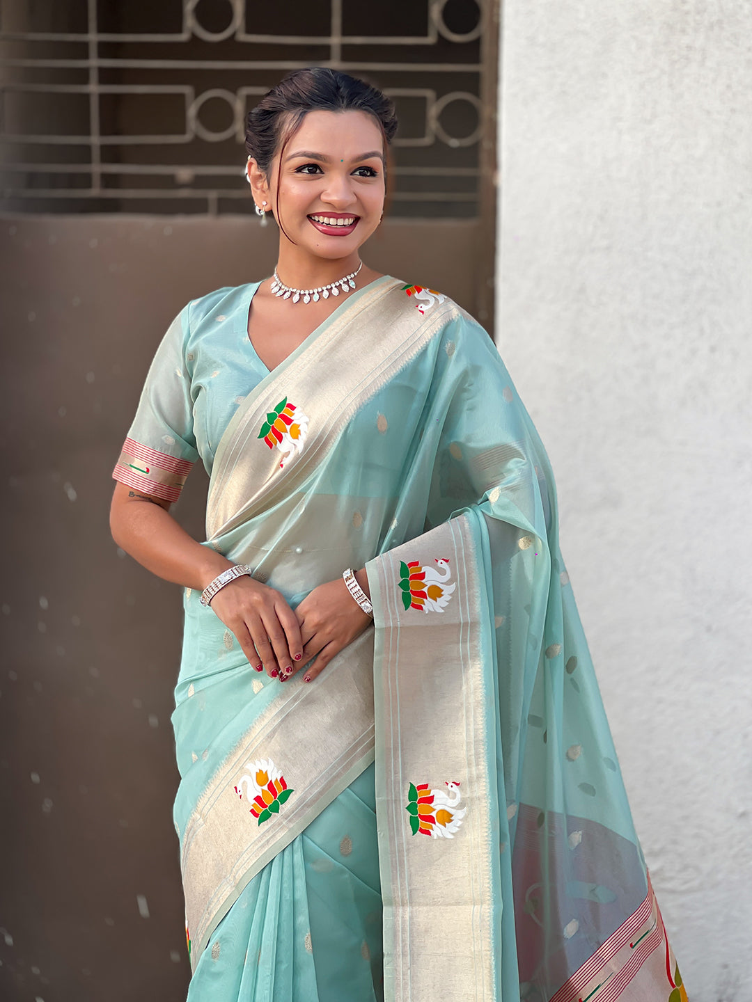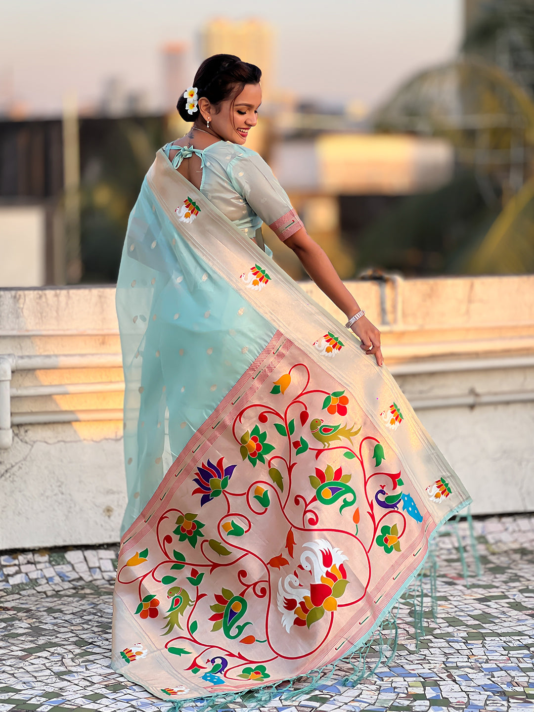 Sky Blue Organza Swan Paithani Silk Zari Woven Saree