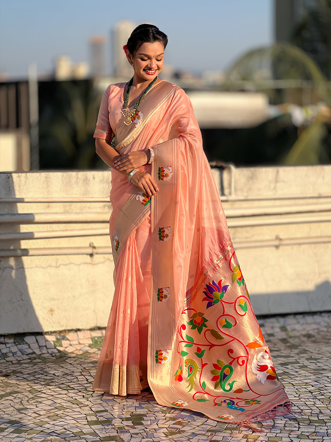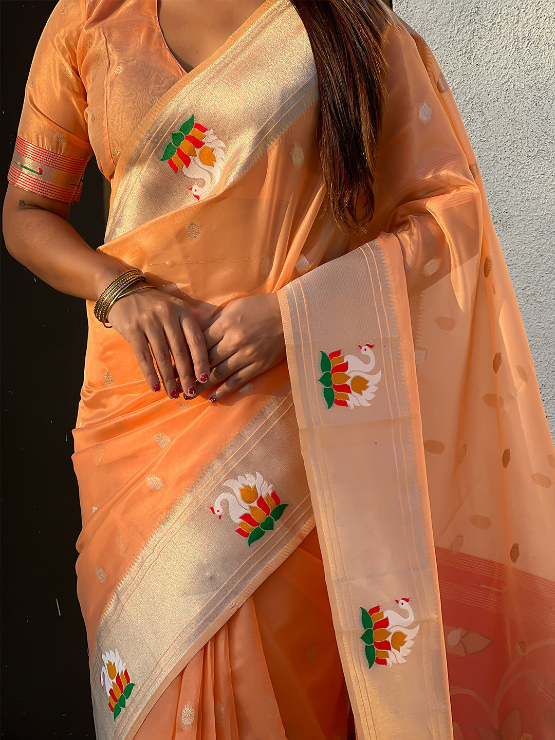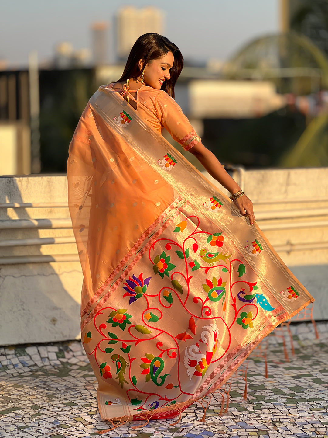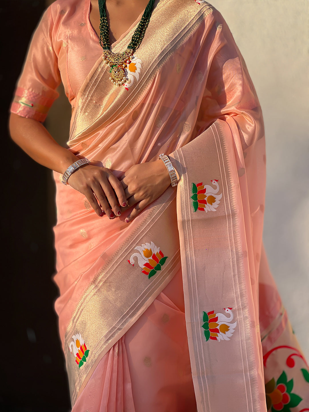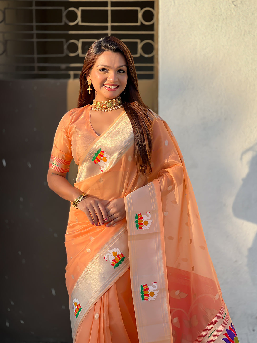Peach Organza Swan Paithani Silk Zari Woven Saree