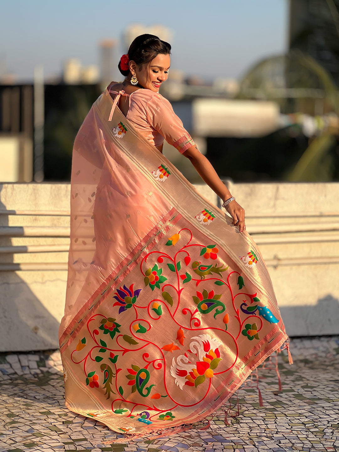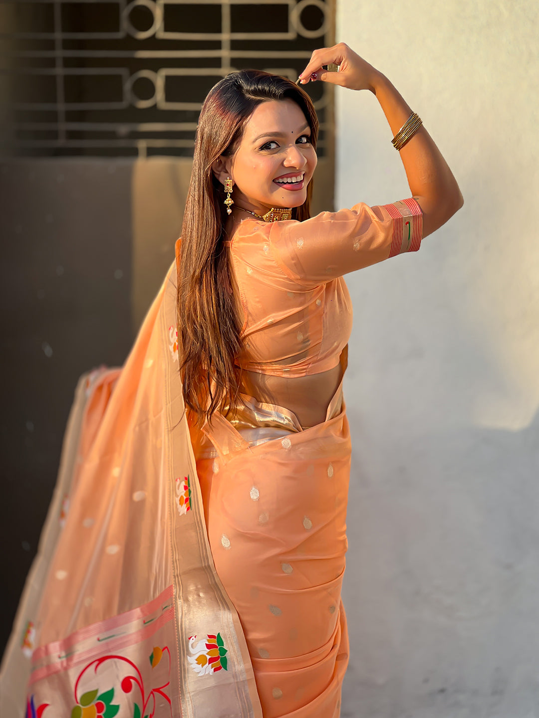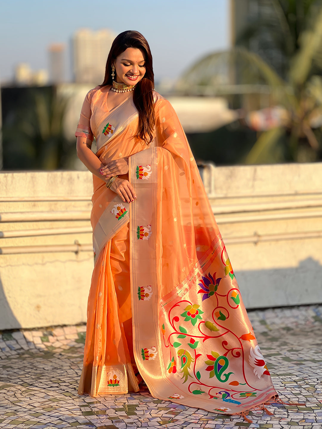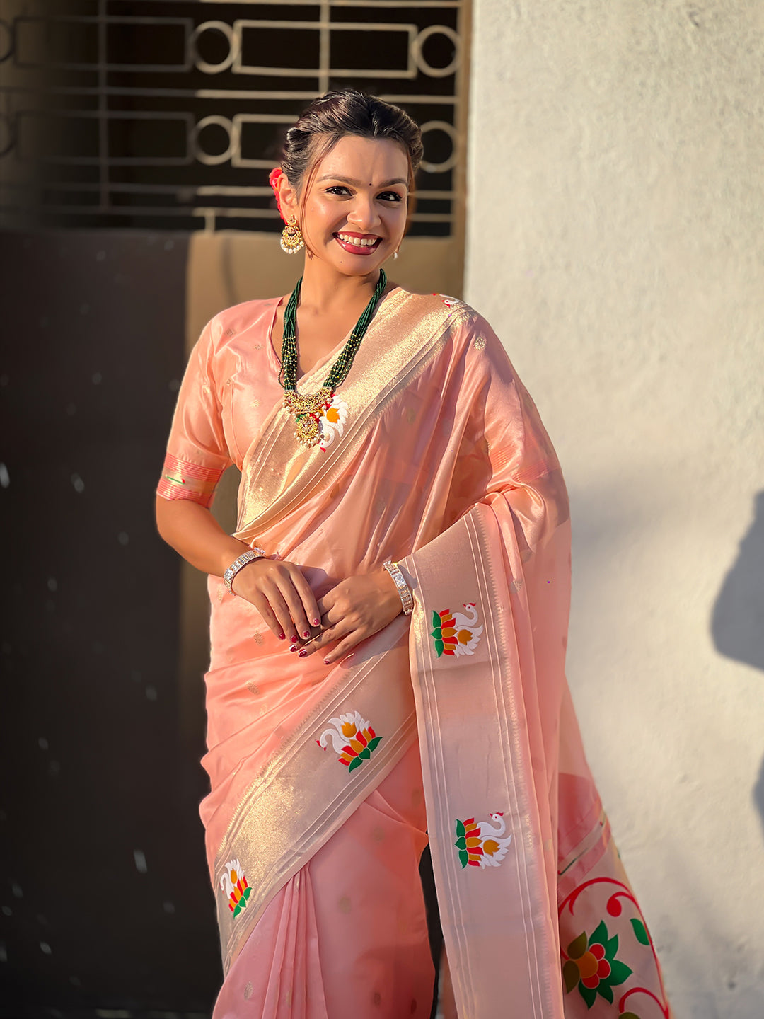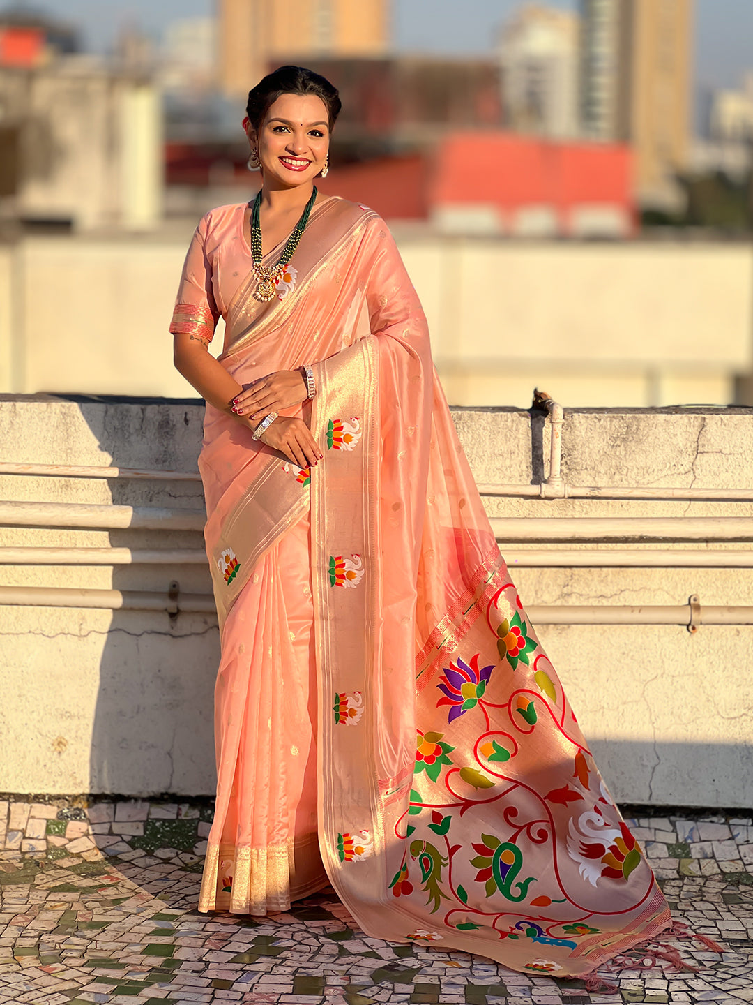 Peach Organza Swan Paithani Silk Zari Woven Saree