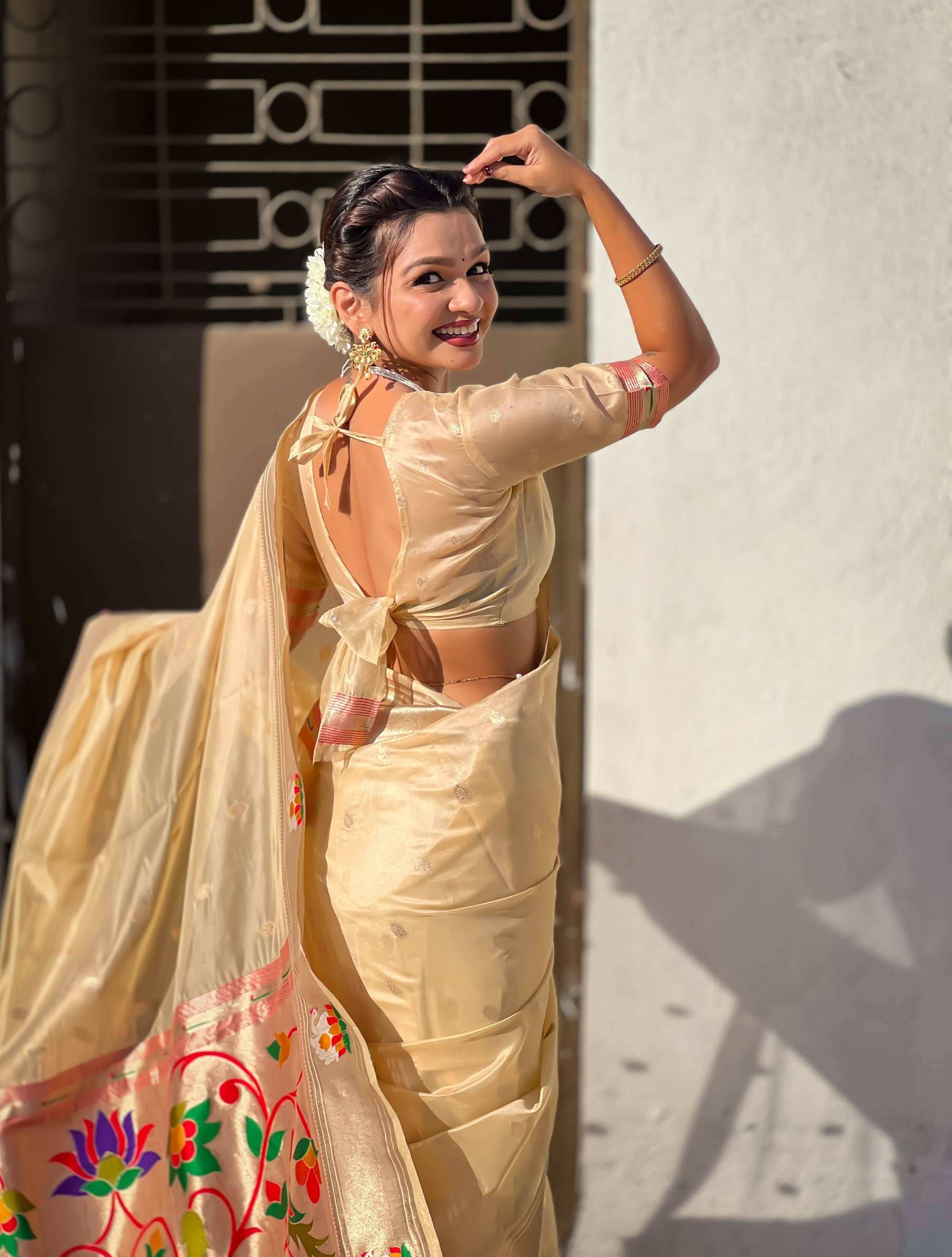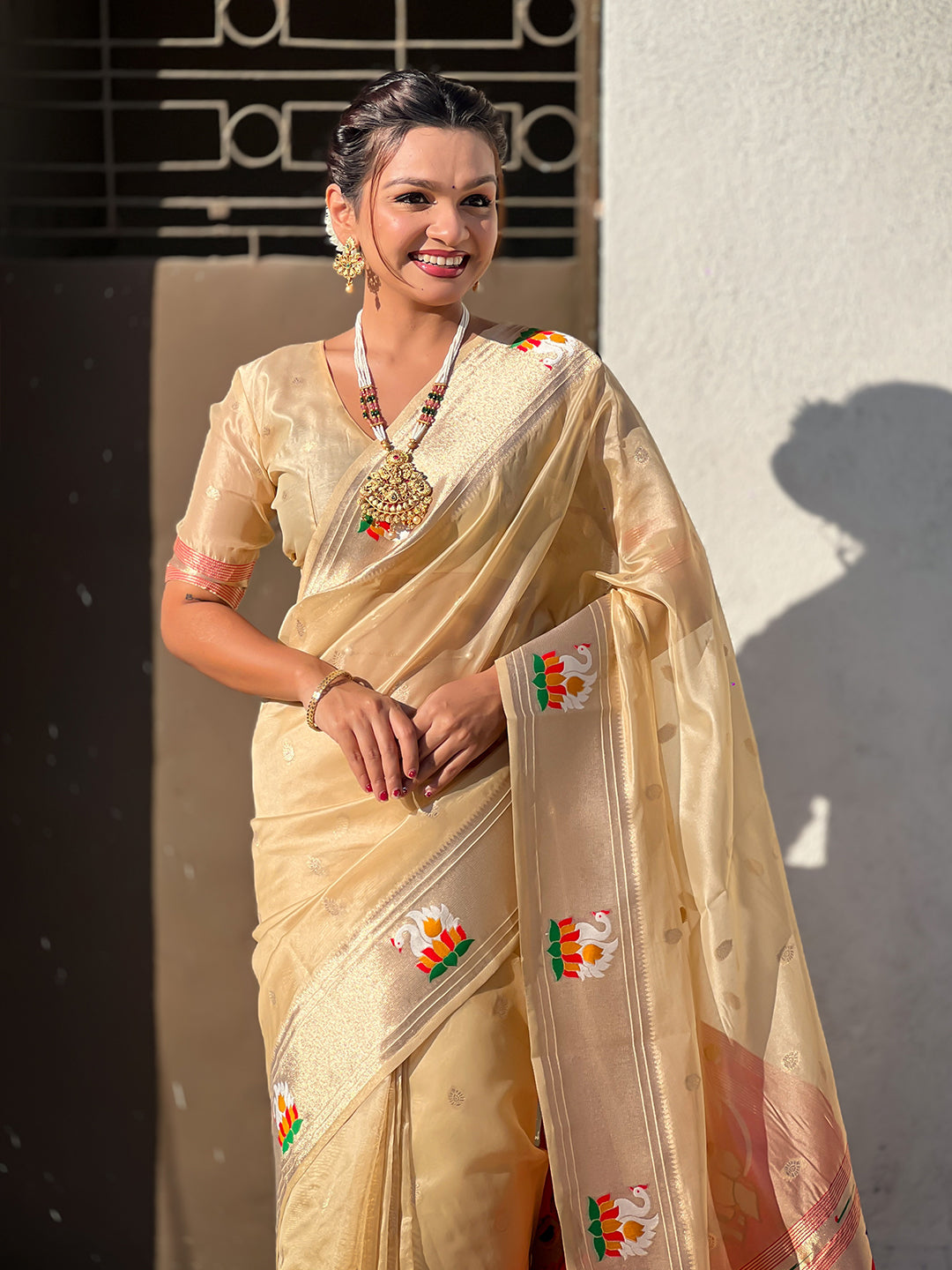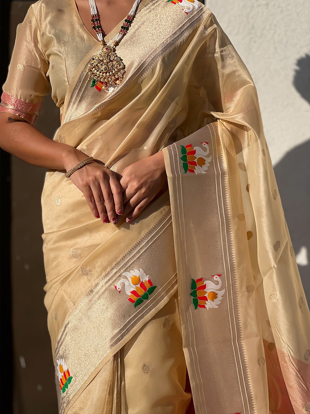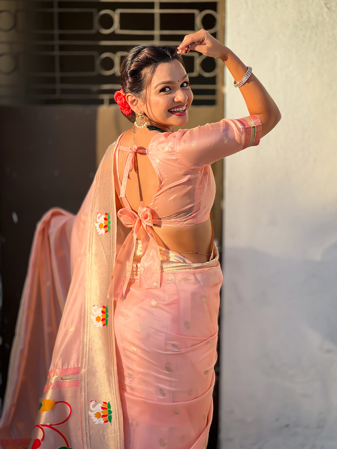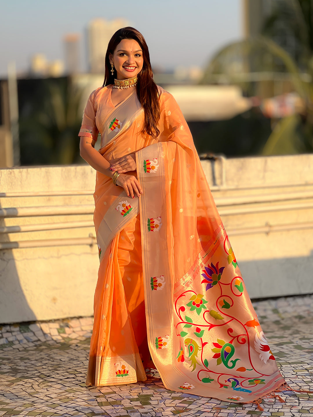 Peach Organza Swan Paithani Silk Zari Woven Saree